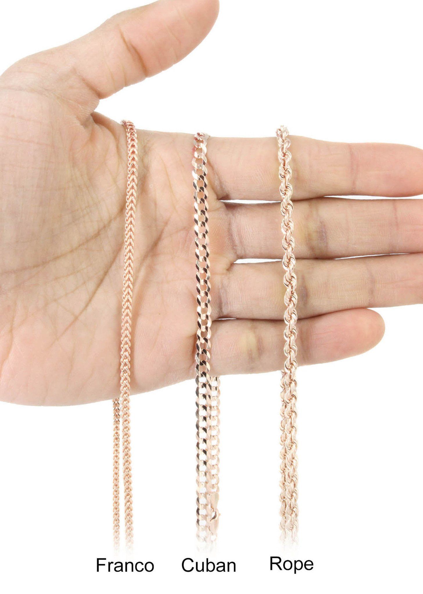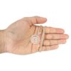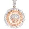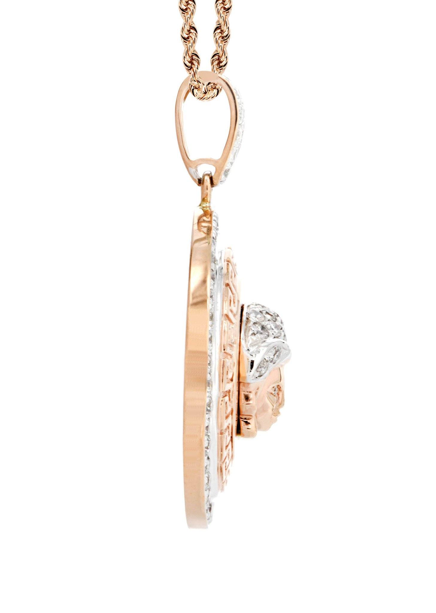 10k Rose Gold Versace Diamond Pendant & Franco Chain which comes in 1.2 Inches in length and 1 Inches in width. The pendant has 1.02 Carats of Vs quality diamonds. The chain options include a 10k gold cuban chain, franco or rope with a width of 3mm’s and the length can be selected to any preference.