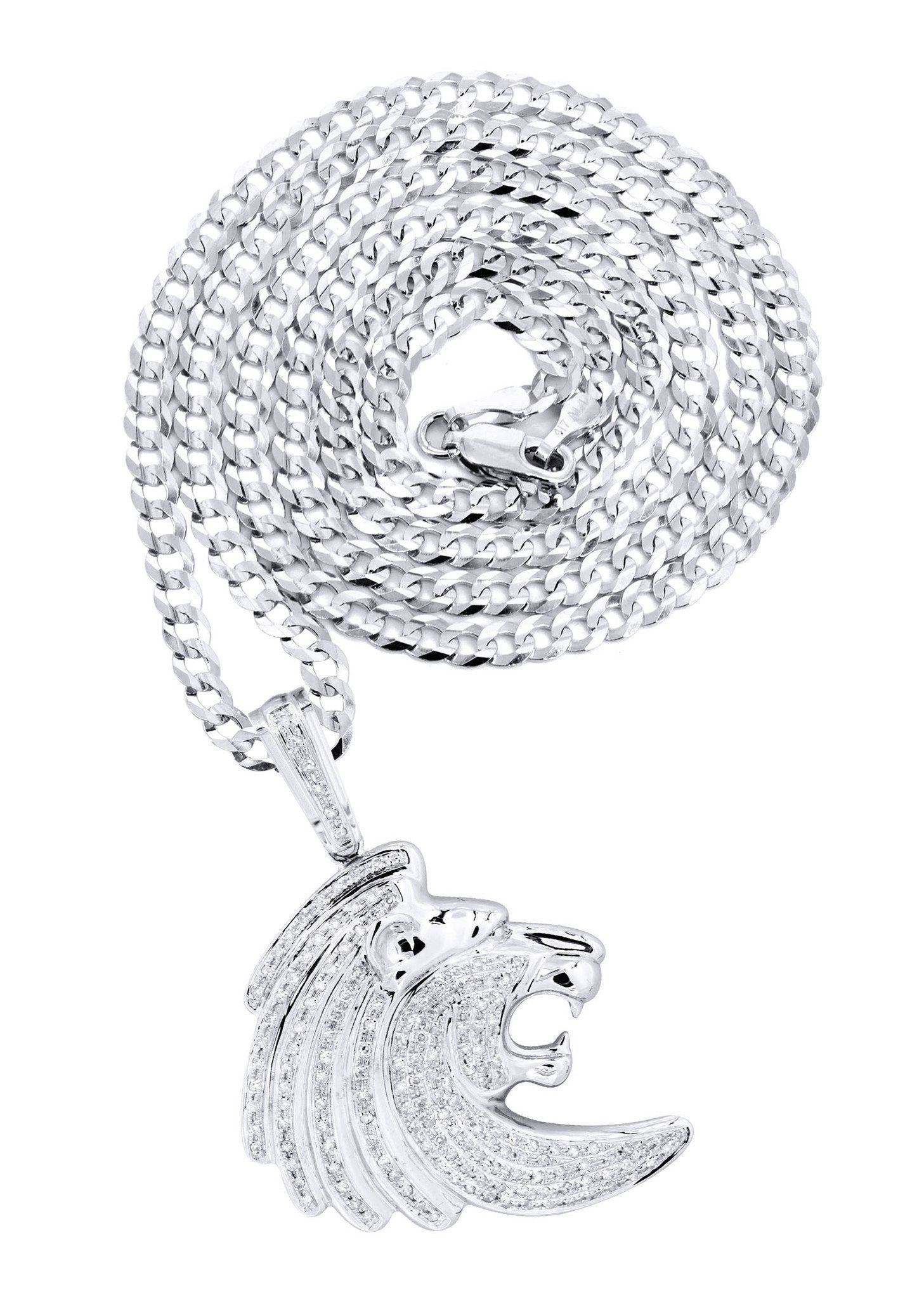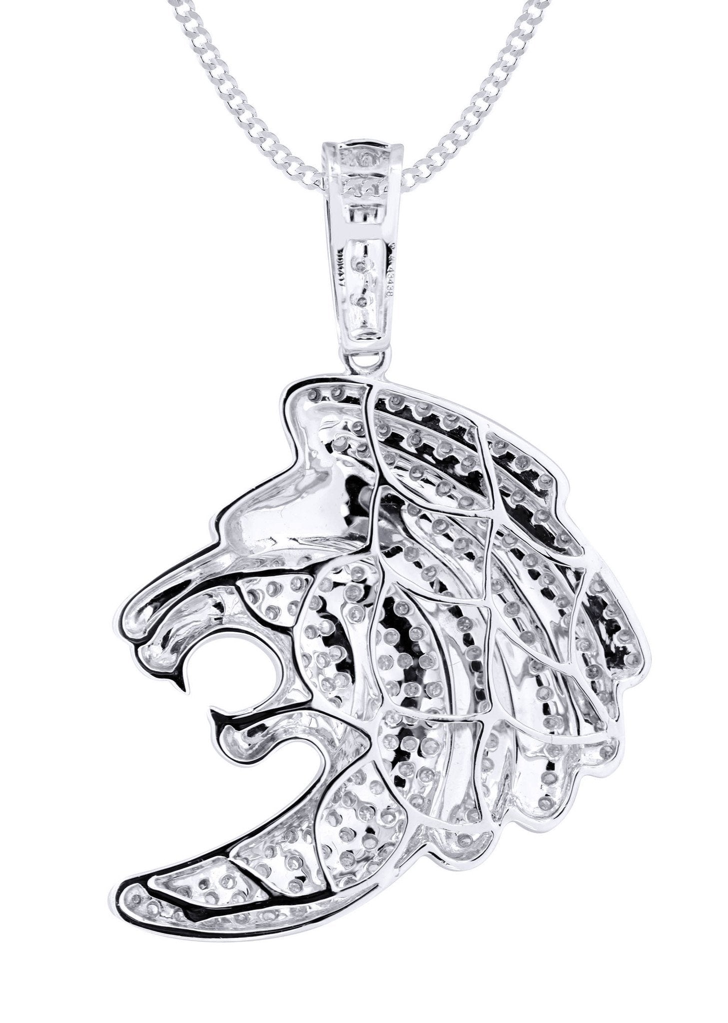10k White Gold Lion Head Diamond Pendant & Cuban Chain which comes in 2 Inches in length and 1.25 Inches in width. The pendant has 0.79 Carats of Vs quality diamonds. The chain options include a 10k gold cuban chain, franco or rope with a width of 3mm’s and the length can be selected to any preference.