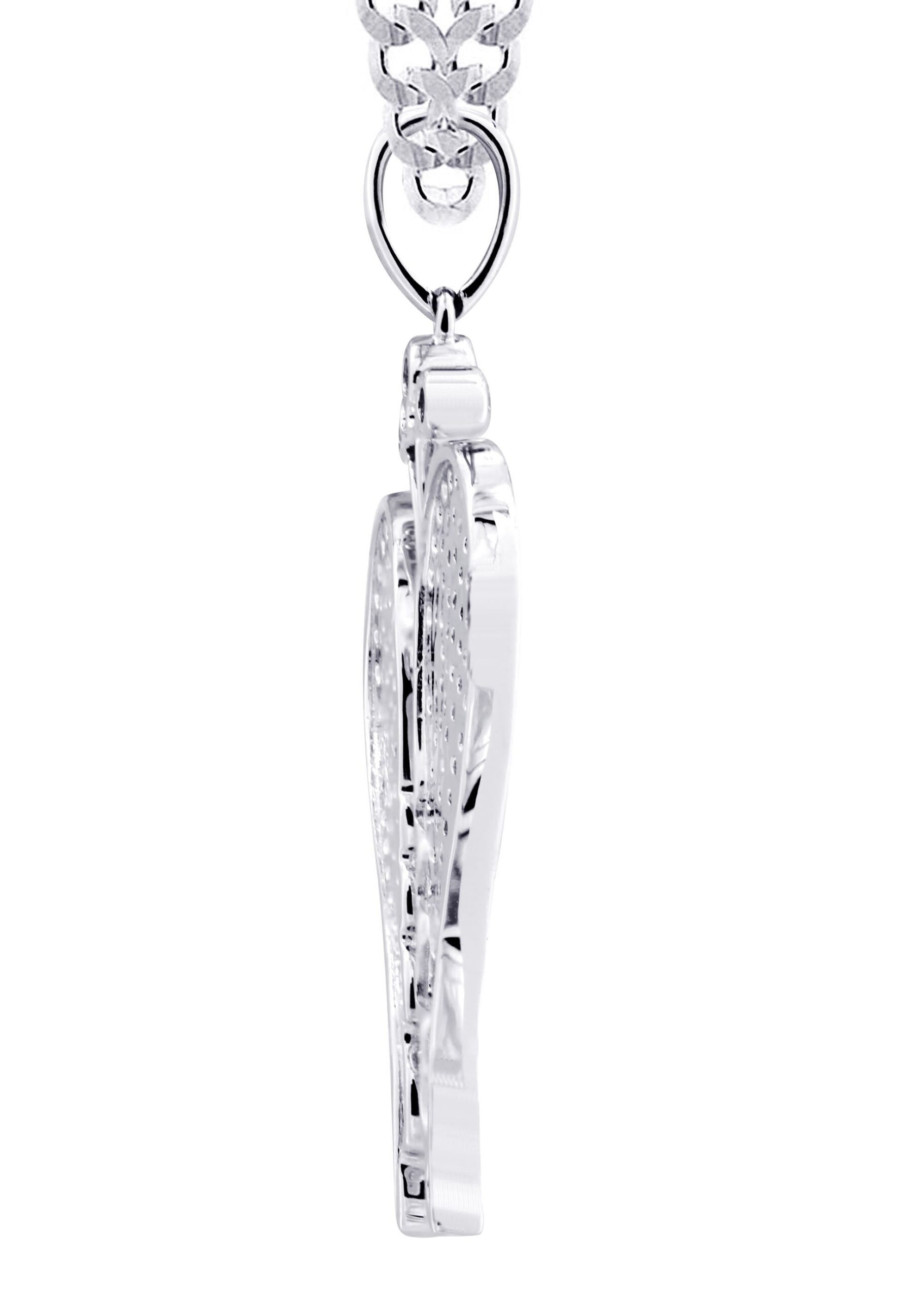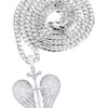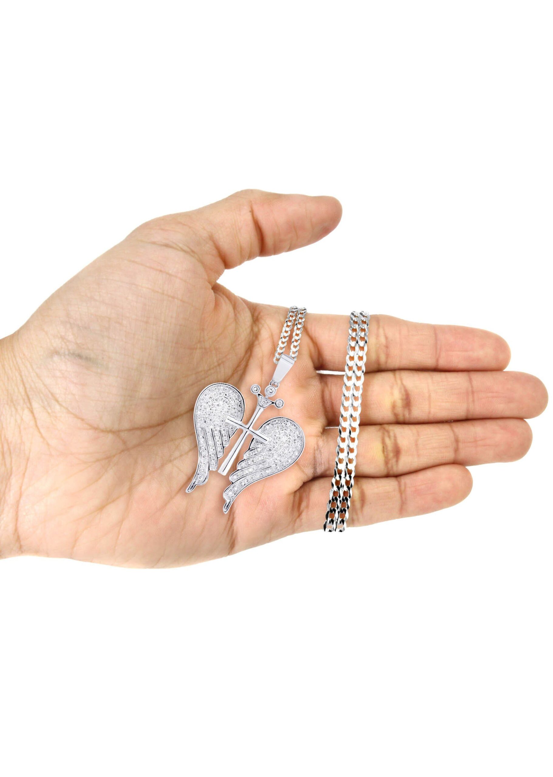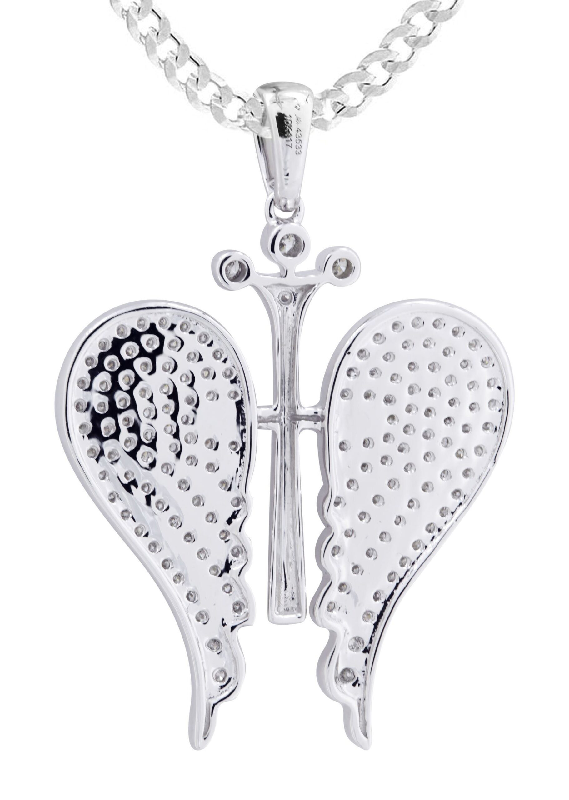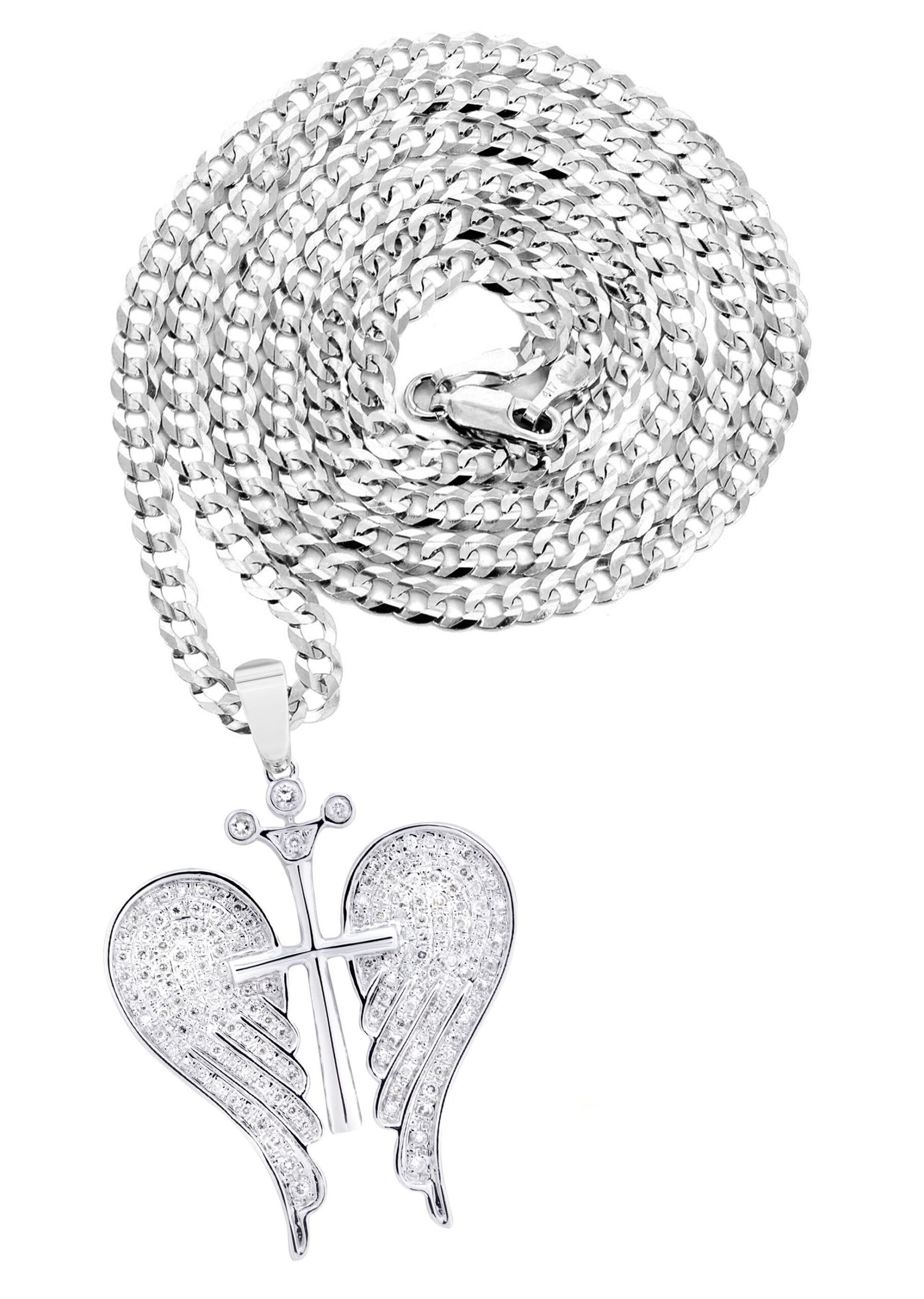 10K White Gold Wings Pendant & Rope Chain With Approximately 0.86 Carats Of Diamonds. The Pendant Width Is 1.5 Inches And The Length Is 1.75 Inches. The Chain Options Include A 10k Gold Cuban Chain, Franco Or Rope With A Width Of 3mm’s And The Length Can Be Selected To Any Preference.