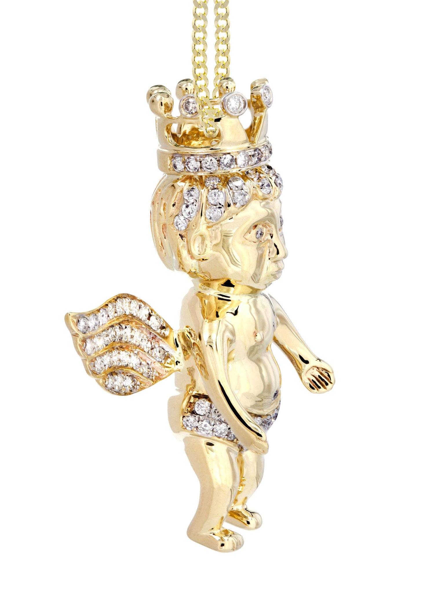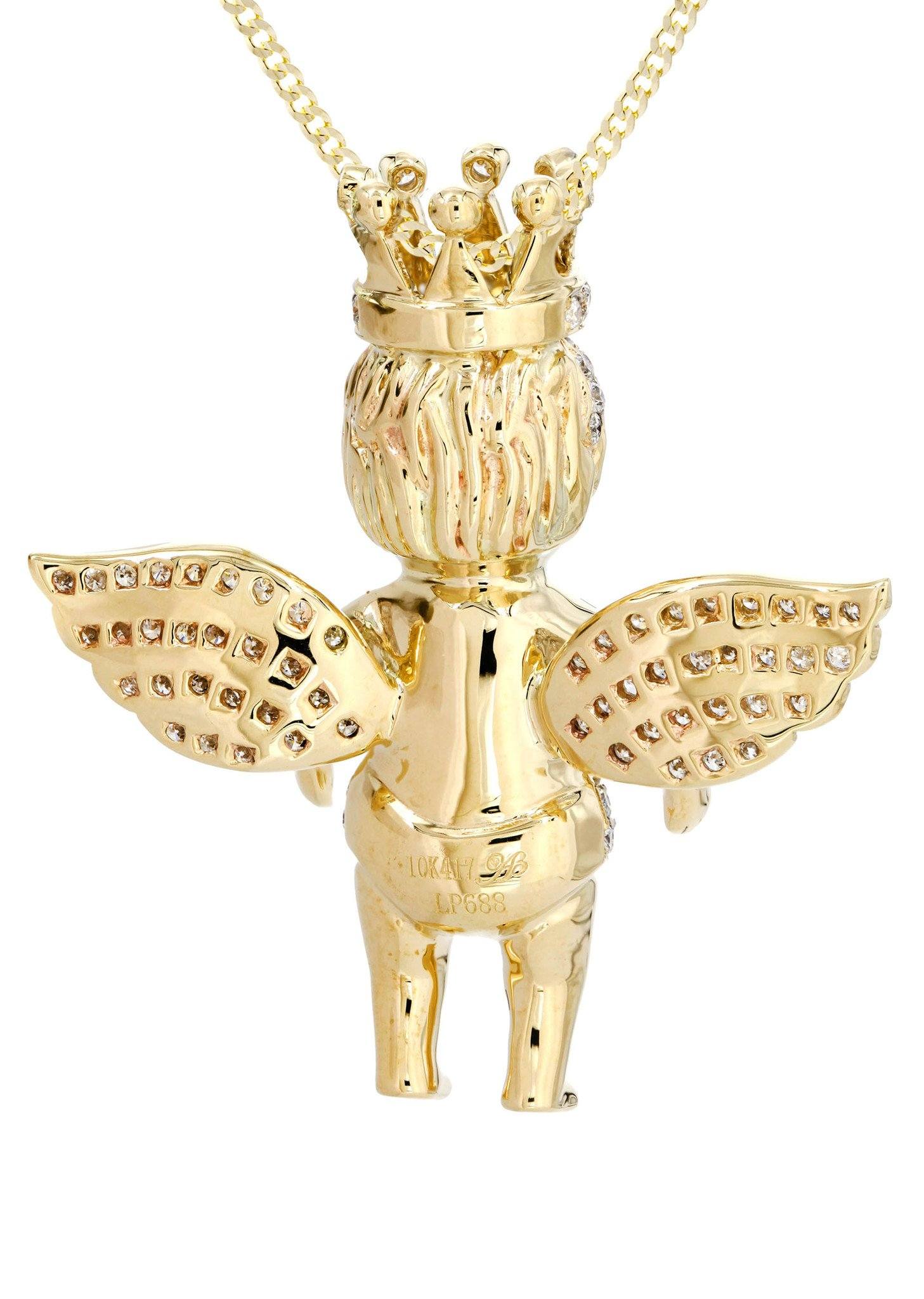 10K Yellow Gold Angel Diamond Pendant & Cuban Chain which comes in 1.75 Inches in length and 1.5 Inches in width. The pendant has 1.72 Carats of Vs quality diamonds. The chain options include a 10k gold cuban chain, franco or rope with a width of 3mm’s and the length can be selected to any preference.-100% REAL GOLD
