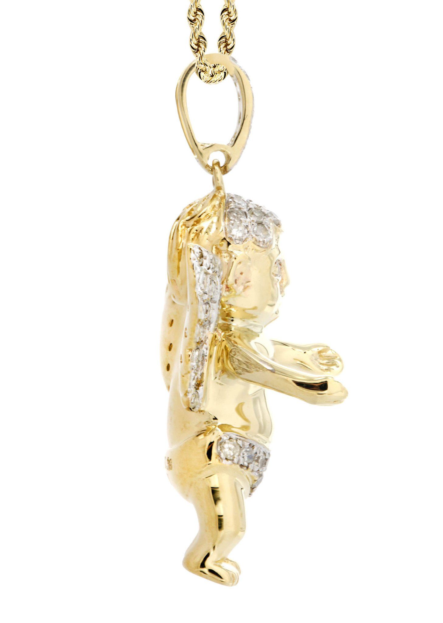 10 Yellow Gold Angel Diamond Pendant & Rope Chain which comes in 1.4 Inches in length and 1 Inches in width. The pendant has 0.96 Carats of Vs quality diamonds. The chain options include a 10k gold cuban chain, franco or rope with a width of 3mm’s and the length can be selected to any preference. -100% REAL GOLD