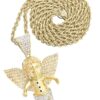 10 Yellow Gold Angel Diamond Pendant & Rope Chain which comes in 2.5 Inches in length and 1.75 Inches in width. The pendant has 2.69 Carats of Vs quality diamonds. The chain options include a 10k gold cuban chain, franco or rope with a width of 3mm’s and the length can be selected to any preference. -100% REAL GOLD