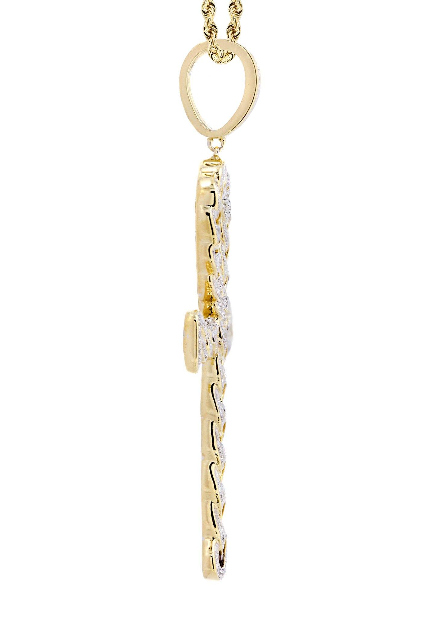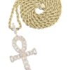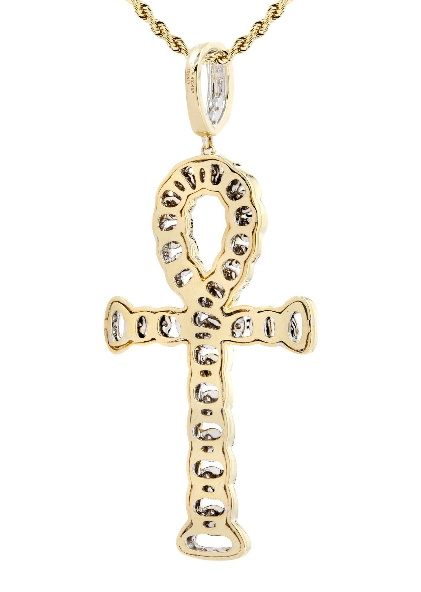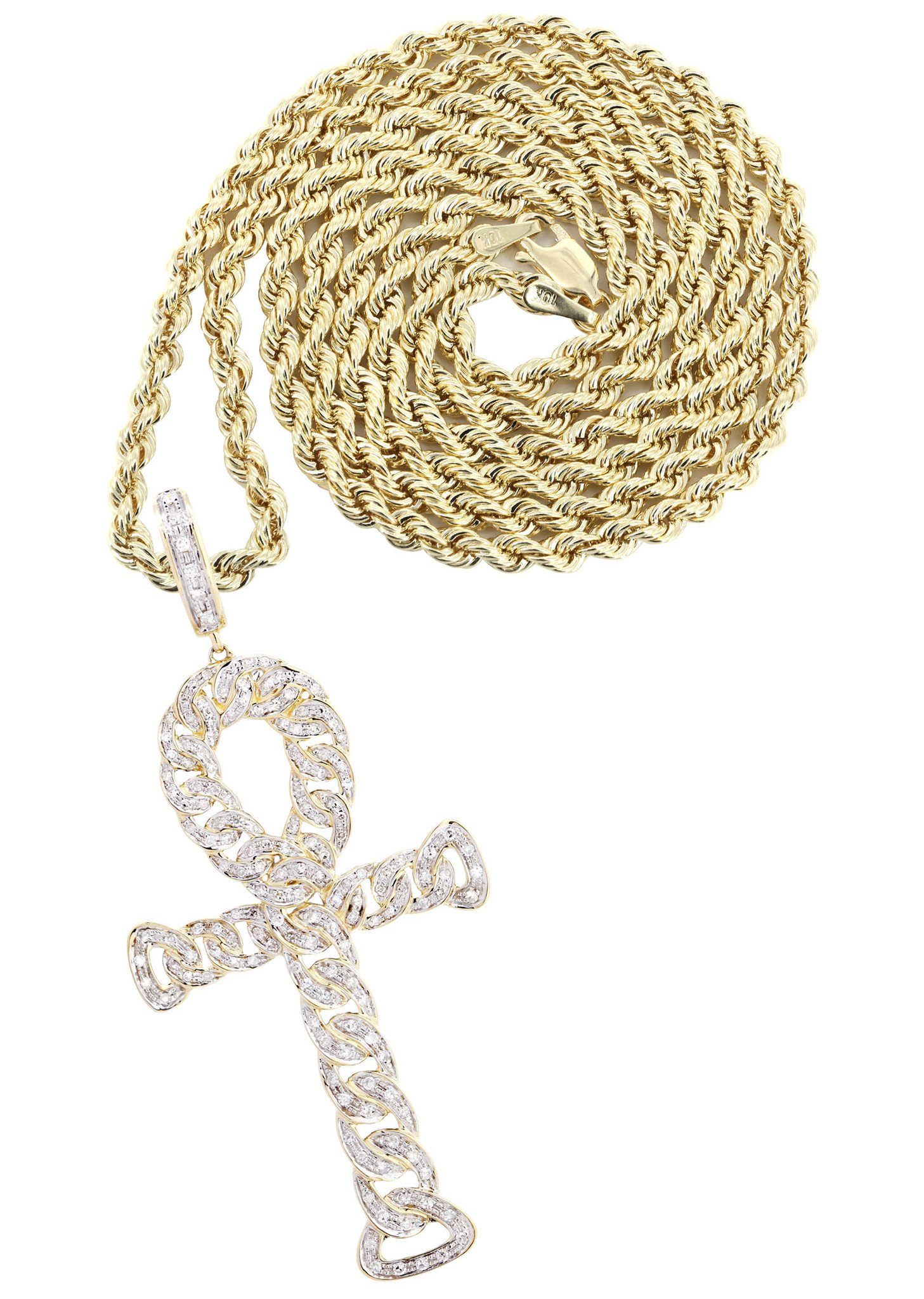 10k Yellow Gold Ankh Diamond Pendant & Rope Chain which comes in 2.9 Inches in length and 1.4 Inches in width. The pendant has 0.79 Carats of Vs quality diamonds. The chain options include a 10k gold cuban chain, franco or rope with a width of 3mm’s and the length can be selected to any preference. -100% REAL GOLD