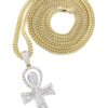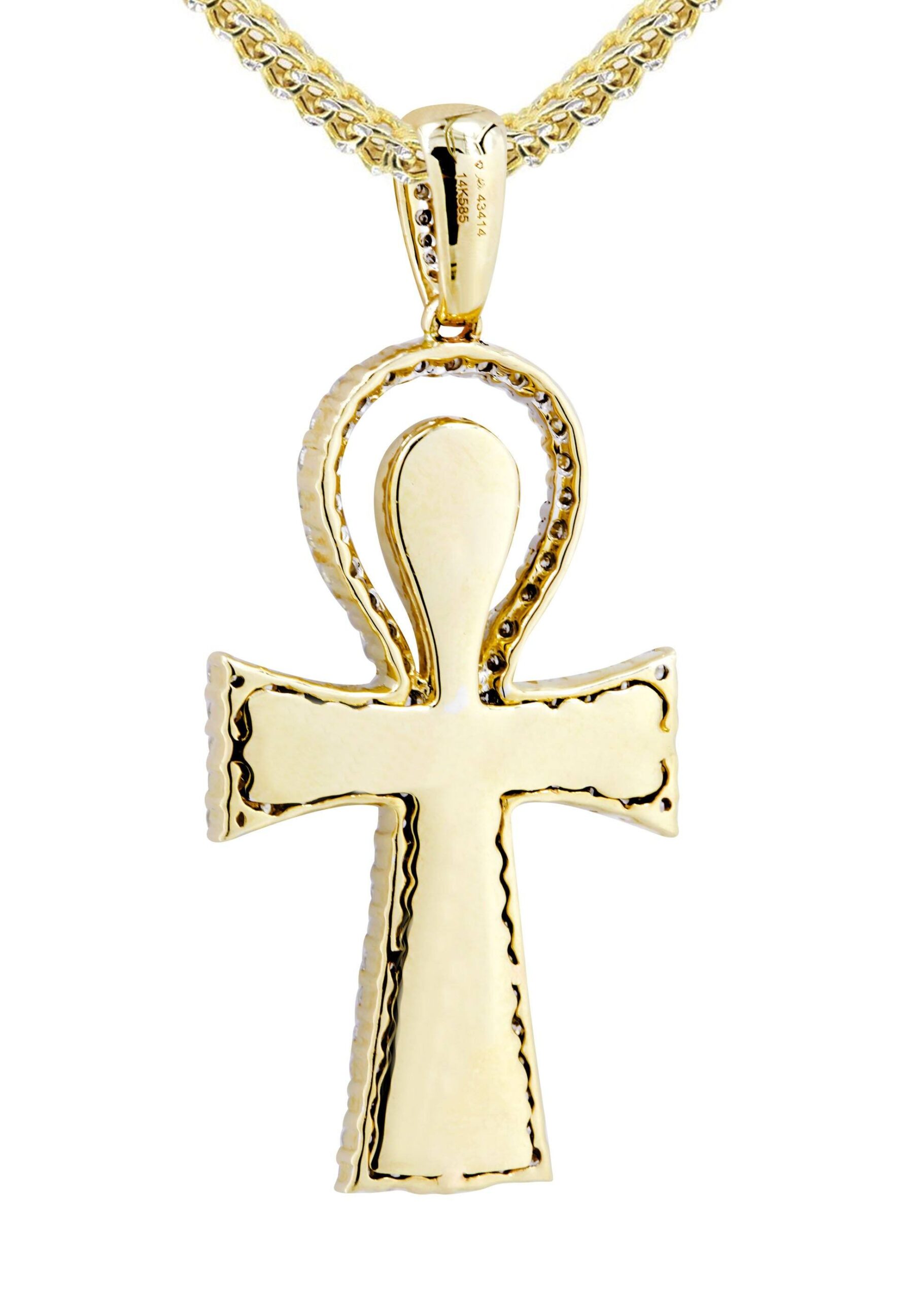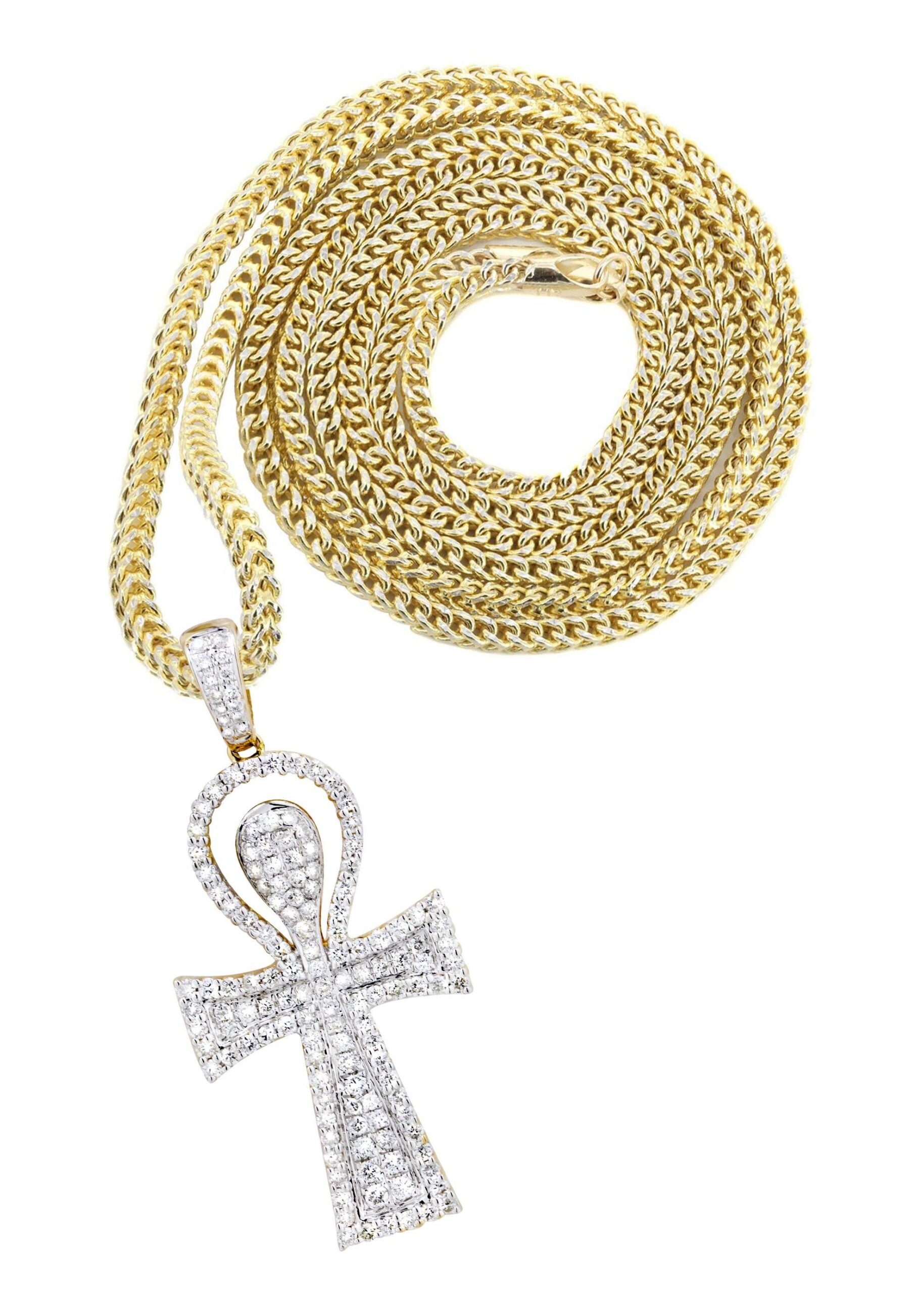 10K Yellow Gold Ankh Pendant & Franco Chain With Approximately 0.77 Carats Of Diamonds. The Pendant Width Is 0.6 Inches And The Length Is 1.5 Inches. The Chain Options Include A 10k Gold Cuban Chain, Franco Or Rope With A Width Of 3mm’s And The Length Can Be Selected To Any Preference.